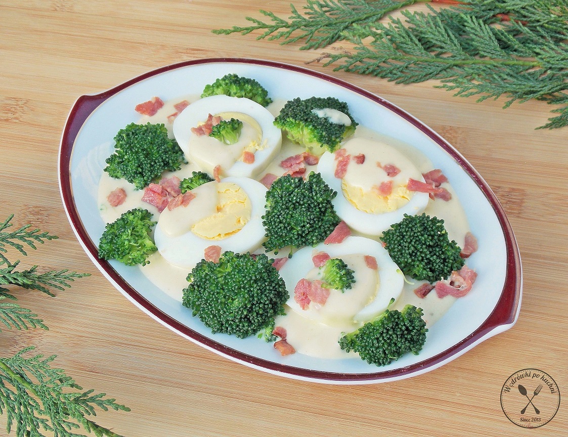 Przygotowanie sosuDo rondelka wrzucamy boczek pokrojony w drobną kostkę. Smażymy do wytopienia się tłuszczu i przekładamy na talerz. Do tego samego rondelka wrzucamy masło. Kiedy masło się rozpuści i zacznie się smażyć dodajemy mąkę i energicznie mieszamy tak, aby powstała jasna zasmażka. Najlepiej do mieszania użyć trzepaczki. Nie przerywając mieszania dodajemy bulion, śmietankę i wodę z brokułów. Wody z brokułów dodajemy tyle, aby uzyskać odpowiednią konsystencję sosu. Sos powinien być gładki, kremowy, konsystencji gęstego ciasta naleśnikowego. Sos doprowadzamy do wrzenia, dodajemy musztardę i przyprawiamy do smaku solą, cukrem i pieprzem. Na półmisek wylewamy 3/4 sosu, układamy połówki jajek i różyczki brokuła. Wierzch dekorujemy pozostałym sosem i posypujemy bekonem. |